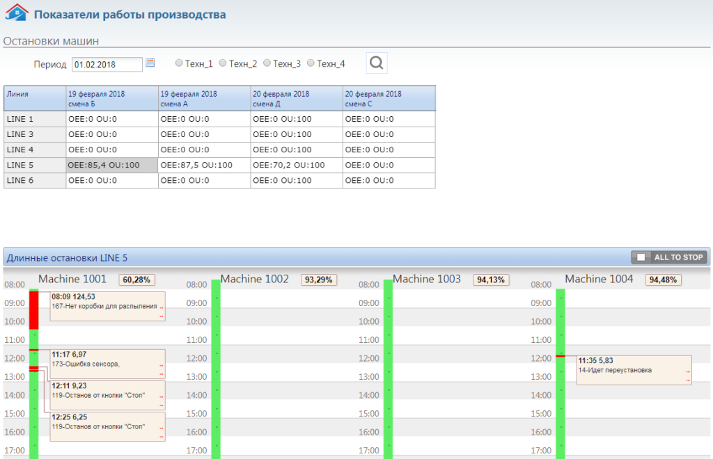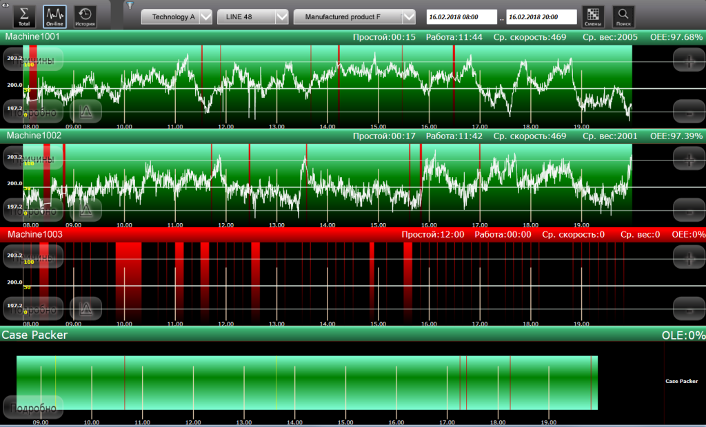 - Сбор и хранение данных о производстве. К получаемым с оборудования данным относятся такие показатели, как состояние машины (остановка/работа), производительность, вес единицы продукции и др. Пользователям доступна история работы за любой период времени.